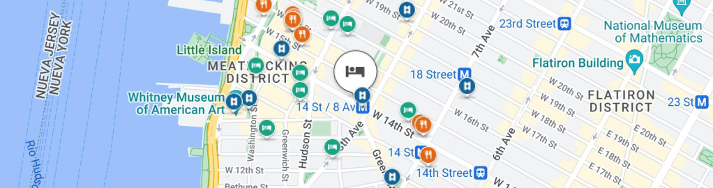 Estuvimos en New York en el Hotel 309, situado en la 309 W 14th St, New York, NY 10014, en Estados Unidos ¿por qué lo elegimos? esencialmente porque es uno de los pocos que incluye desayuno (en la cocina pequeña o en el patio, hay cereales de todo tipo, yogurt, leche, café, pan mermeladas, etc, solo debes acudir temprano). Hotel 309 en New York está cercano a todos los trayectos -caminatas por la ciudad- era posible realizarlas a pie o en metro o en taxi, tiene farmacias CVS cerca, mercados, tiendas de papelería, a metros de Five Guys, próximo a Greenwich Village, al lado del metro 14th ST, está a pasos del Barrio Chelsea, en su interior (Chelsea Market) existe una tienda Posman Book, cerca de Meatpacking District, del parque High Line, está cerca del departamento número 66 en Perry Street (entre Bleecker St y West 4th St, en el Greenwich Village) donde vivía Carrie Bradshaw (personaje de Sex and the City).