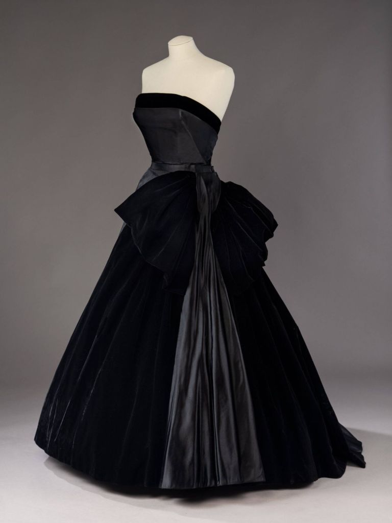 Vestido Cygne Noir Dior, diseño negro sin tirantes, confeccionado en una elegante mezcla de raso y terciopelo.